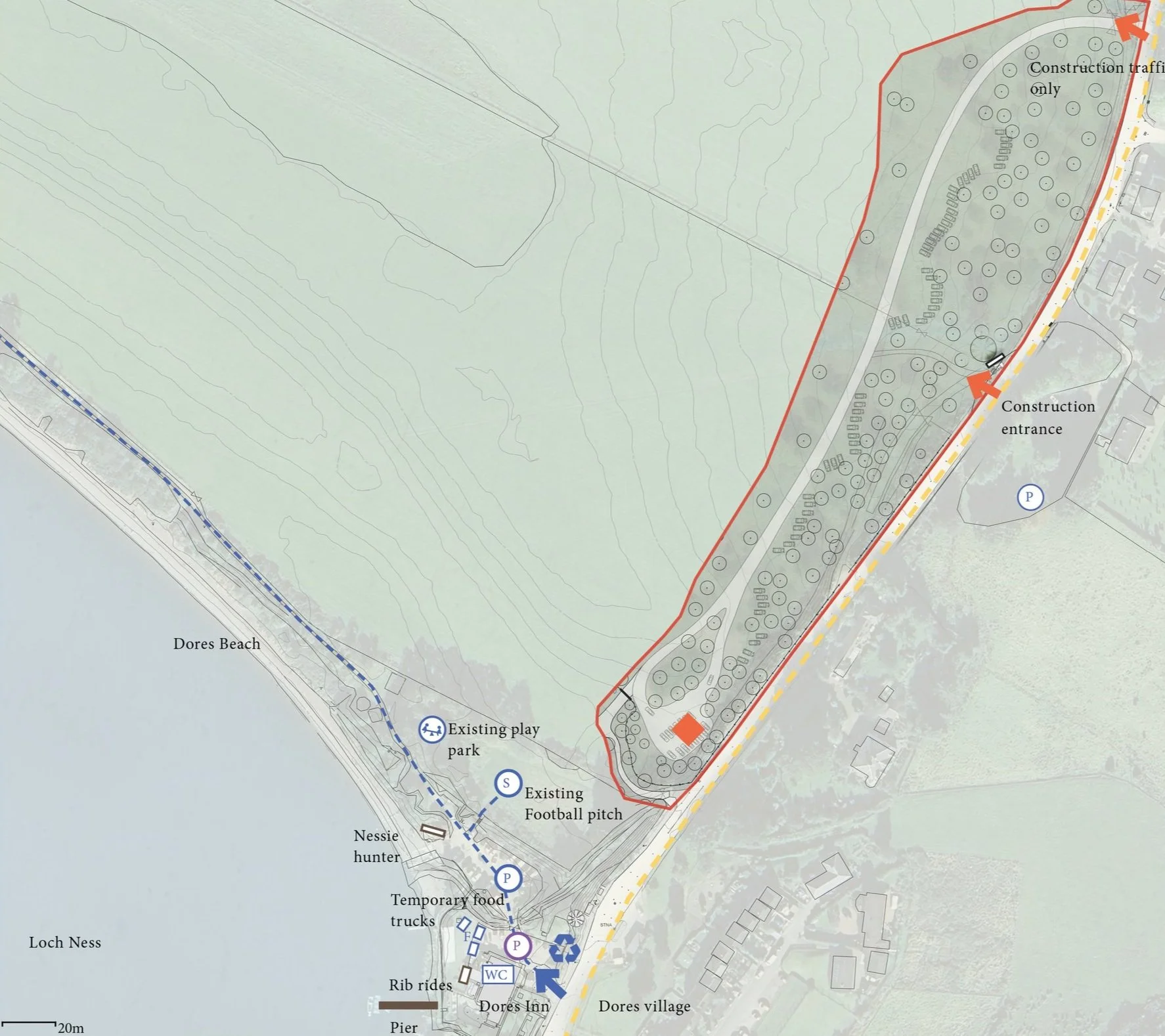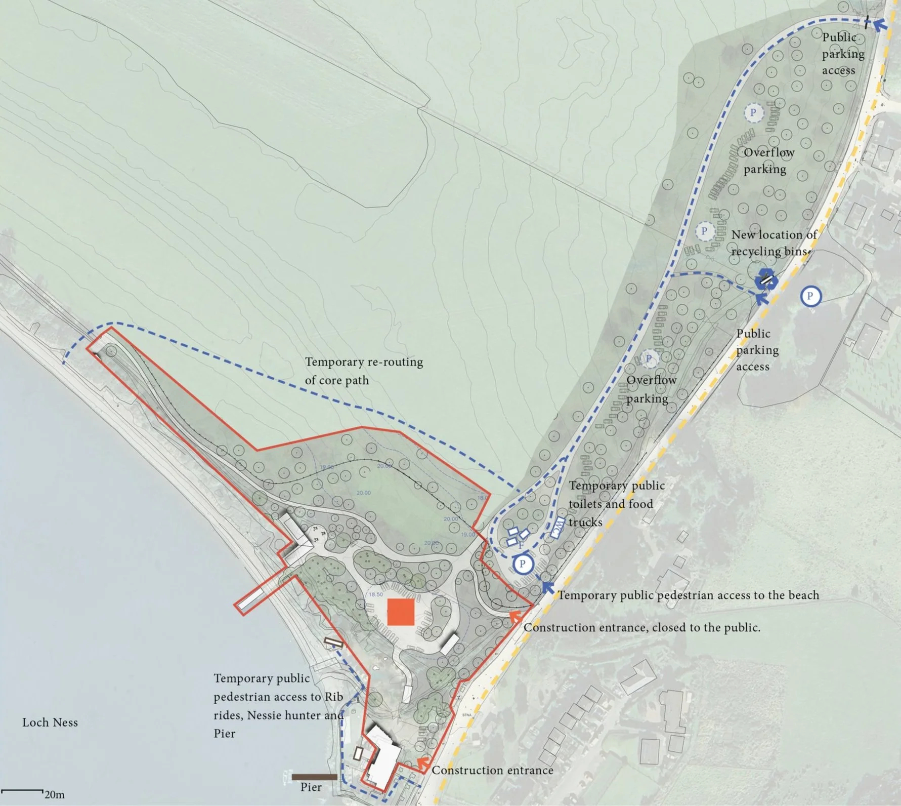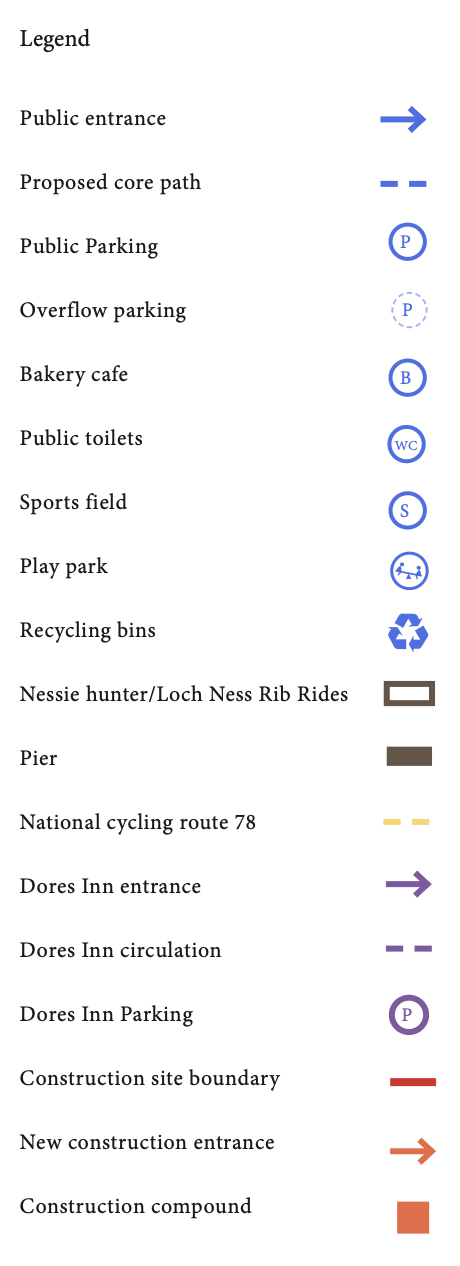The Dores Inn and Beach development will be carefully planned in phases to keep disruption to a minimum while maintaining essential services for visitors. Throughout the entire construction period, public toilets and food purchasing options will always be available, either through existing facilities or temporary alternatives that will be positioned on-site. Each construction phase will include clear pedestrian access routes to the beach and parking areas. The Nessie Hunter and Rib Rides will have continuous access throughout the entire development process, ensuring these popular attractions remain operational. The phased approach will mean that while one area is under construction, visitors will still be able to enjoy other parts of the site, ensuring Dores remains open and accessible to the public throughout the development process.