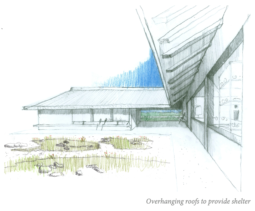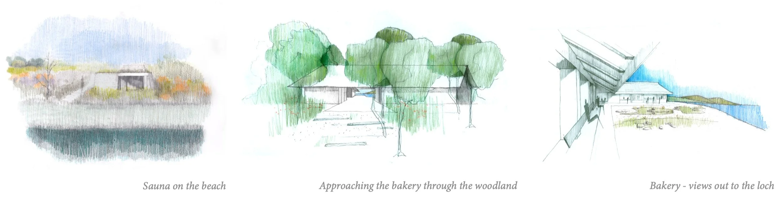 We are proposing that the building will be constructed predominantly from timber, a small amount of stone and a thatch roof. This use of materials intends to soften the building’s appearance within its environment, blending in with its woodland surroundings. The building is designed so to create an informal ‘public square’ in the landscape - set back from the beach. Benches are designed against the building facade, under the overhanging roofs. This offers a communal point to shelter - and to enjoy unrivalled views down the loch. This could provide the space for small pop-up events to take place in the future.